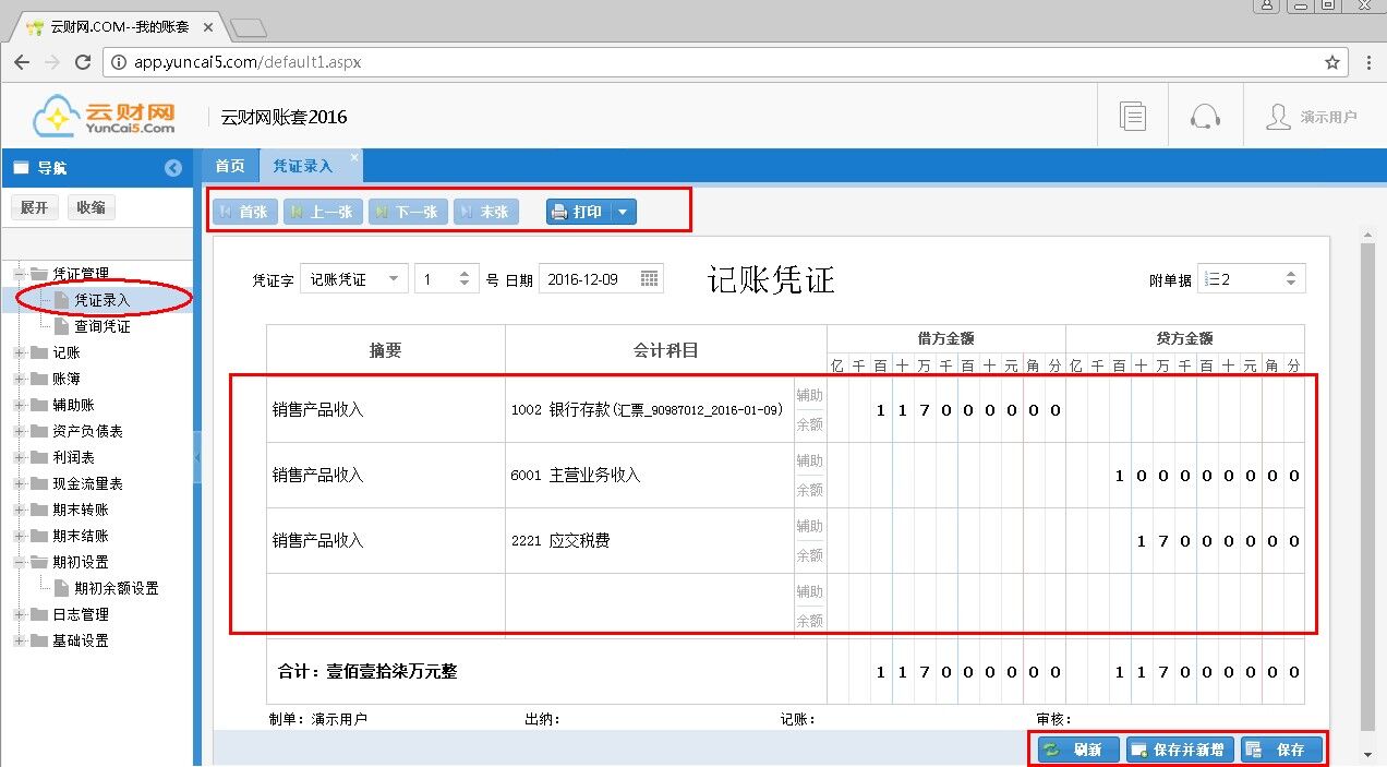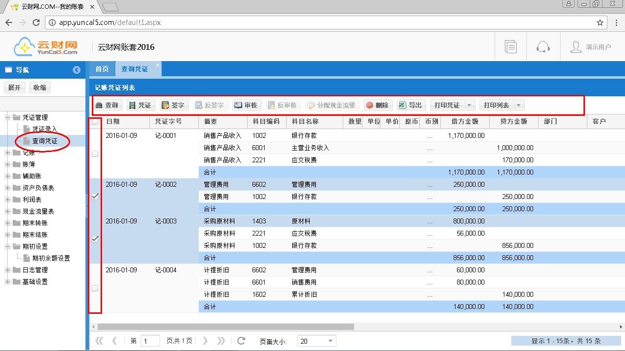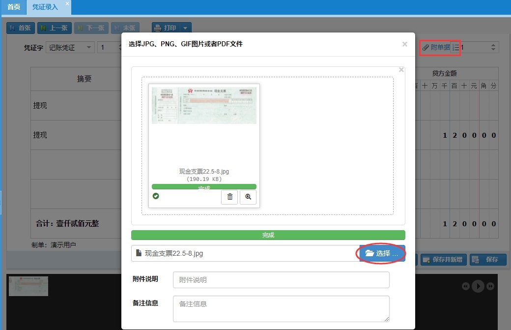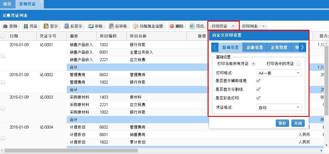 【凭证打印】支持A4一版、A4两版、A4三版和发票版;可以打印选择的凭证,也可以一次性输出所有凭证。