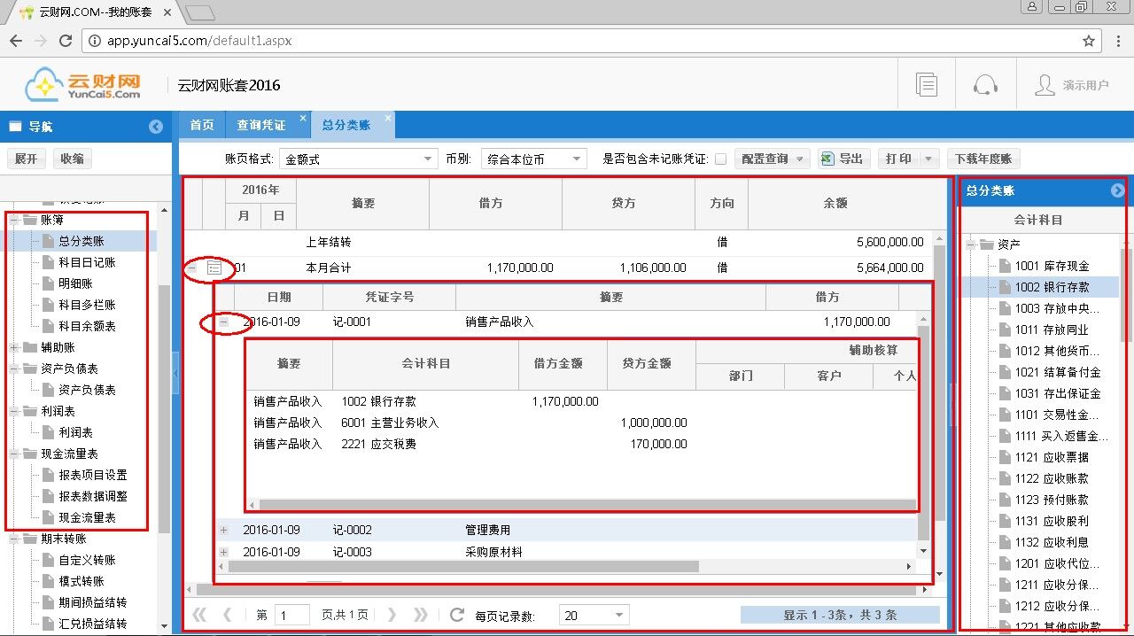 【账簿--总账】→ 【配置查询】→ 选择相应科目,系统自动生成该科目的总账。在总账界面,也可以直接展开总账的明细账,并从明细账展开凭证。