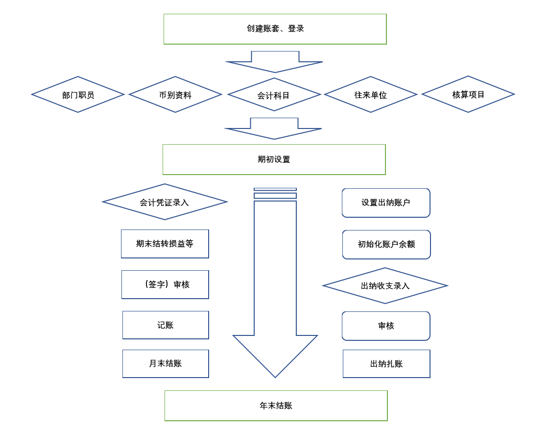 【全局开始】:创建账套并打开→ 基础设置维护(包括:会计科目、币别、部门、职员、客户、供应商、核算项目等)→ 期初余额设置(设置会计科目年初余额);